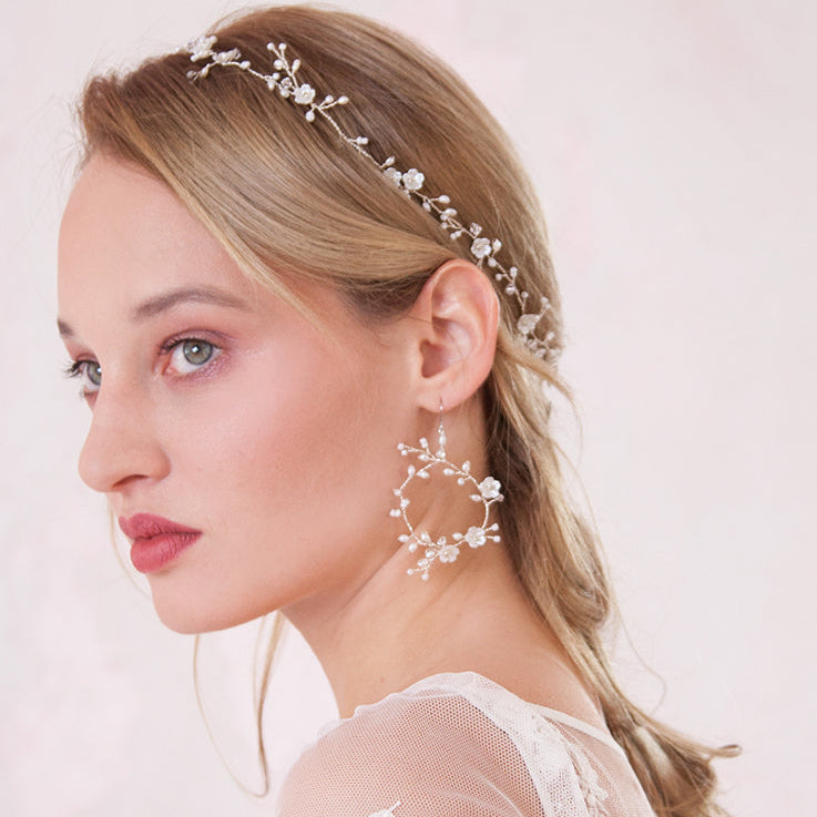 Discover Elibre bridal drop earrings, handcrafted and lightweight, featuring pearls, crystals, and elegant details. Long or hoop designs created to illuminate your face and complete every wedding hairstyle with style and refinement.