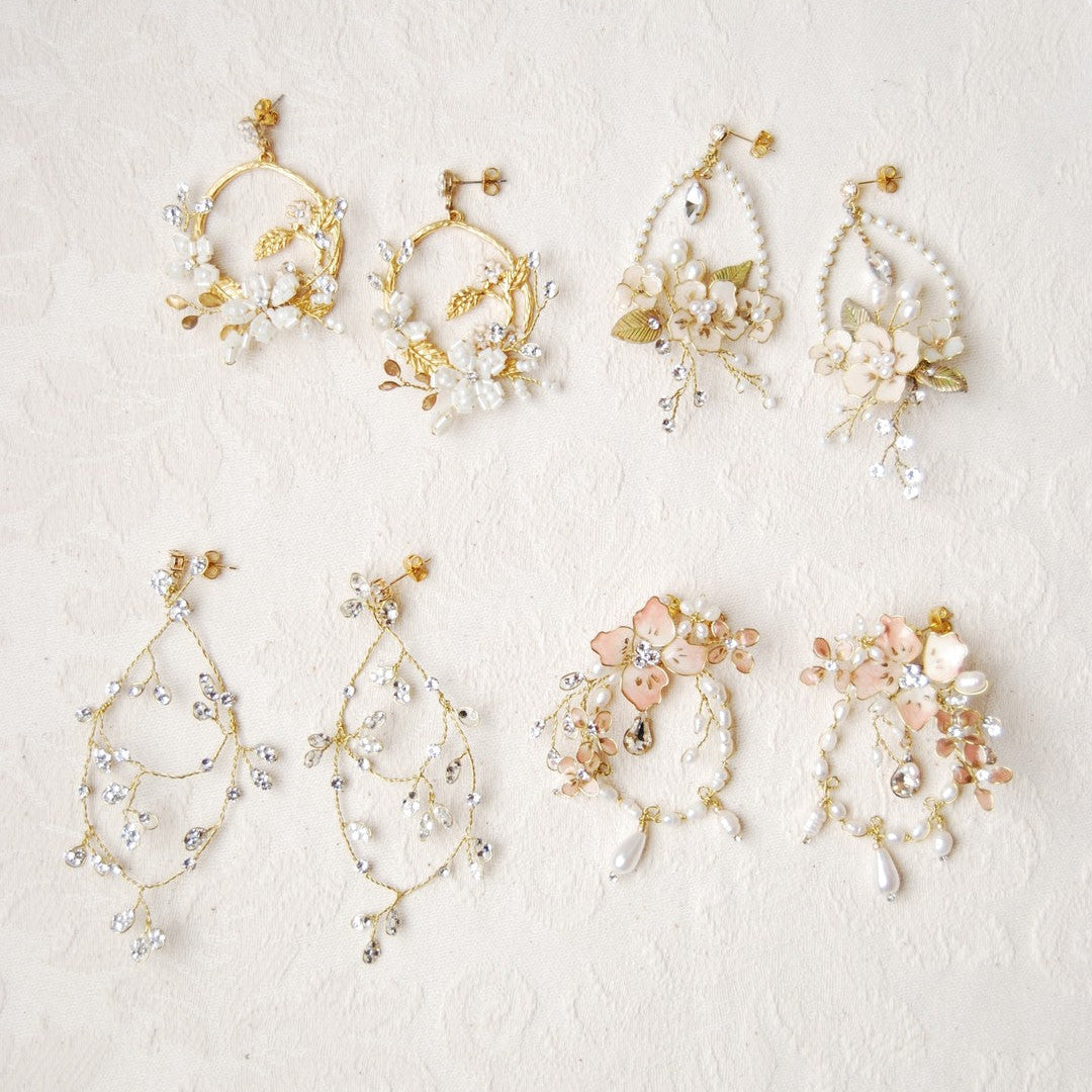 Each pair of earrings can be personalized or paired with matching jewelry and accessories to complete your bridal look with harmony and elegance.