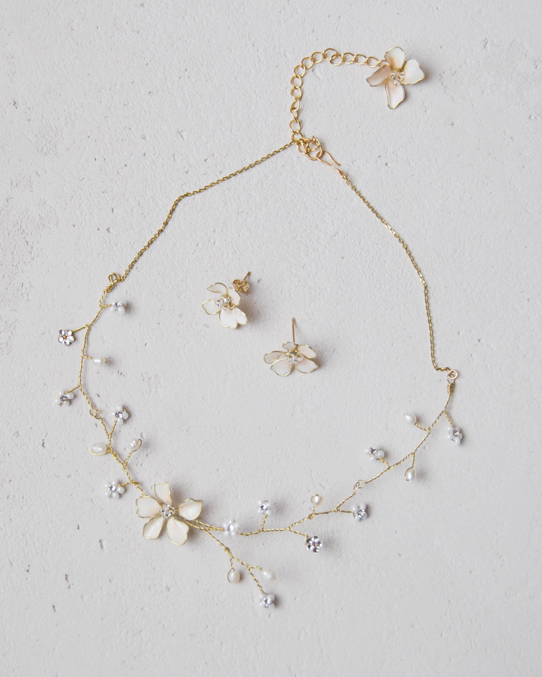Set coordinato da sposa con collana e orecchini a fiori bianchi, perfetto per aggiungere un tocco di classe e femminilità.Collana girocollo da sposa con fiori bianchi dallo stile elegante e senza tempo