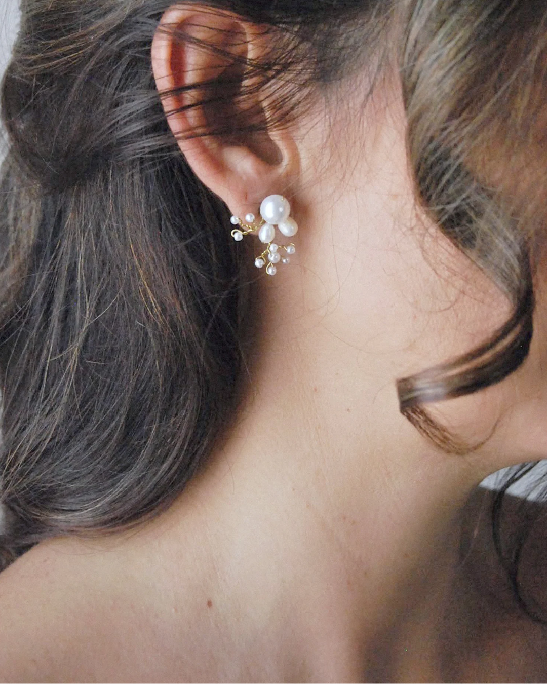 Orecchini pendenti Peonia Biancoluce con perla barocca naturale, un gioiello di lusso organico e artigianale.Orecchini pendenti con perle barocche a goccia indossate