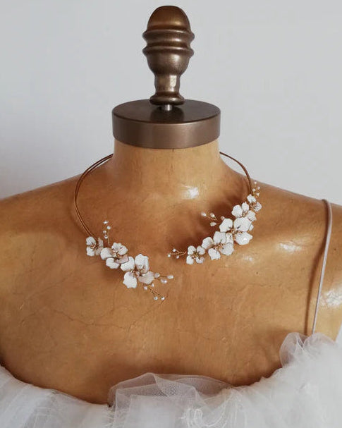Collana rigida con fiori rosa, ideale per scollo a cuore o a V. Fiori delicati sparsi sul girocollo, aggiungono eleganza e raffinatezza al look da sposa.Roseé Necklace