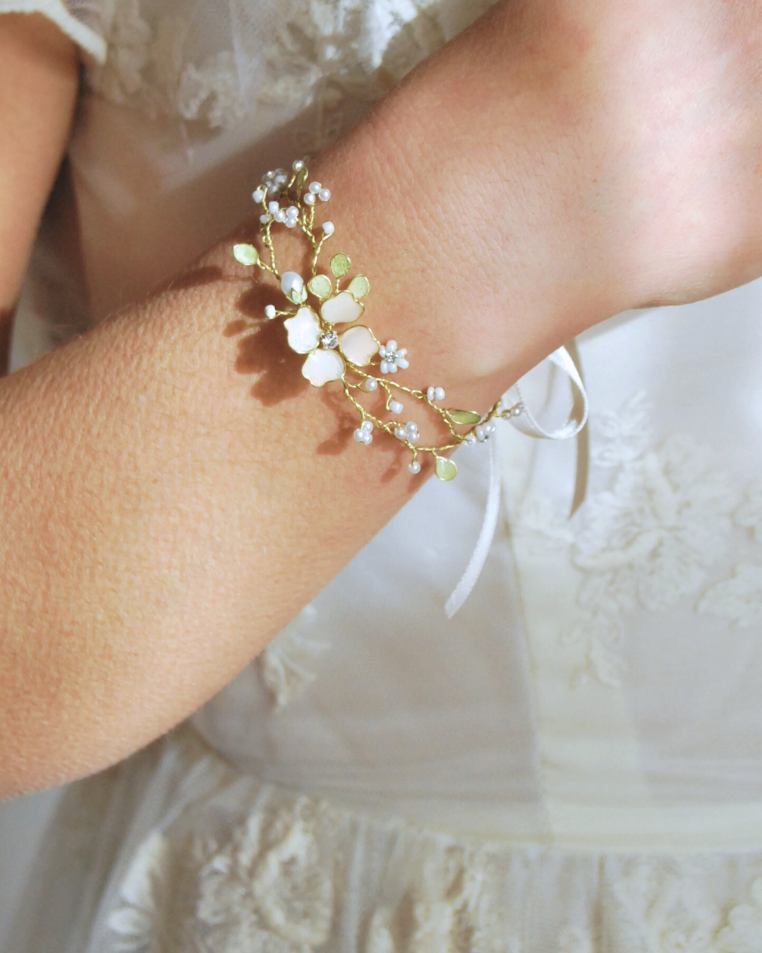 Fermaglio fleur de lune per capelli sposa con fiori e foglie in pizzofermaglio fiori madreperla