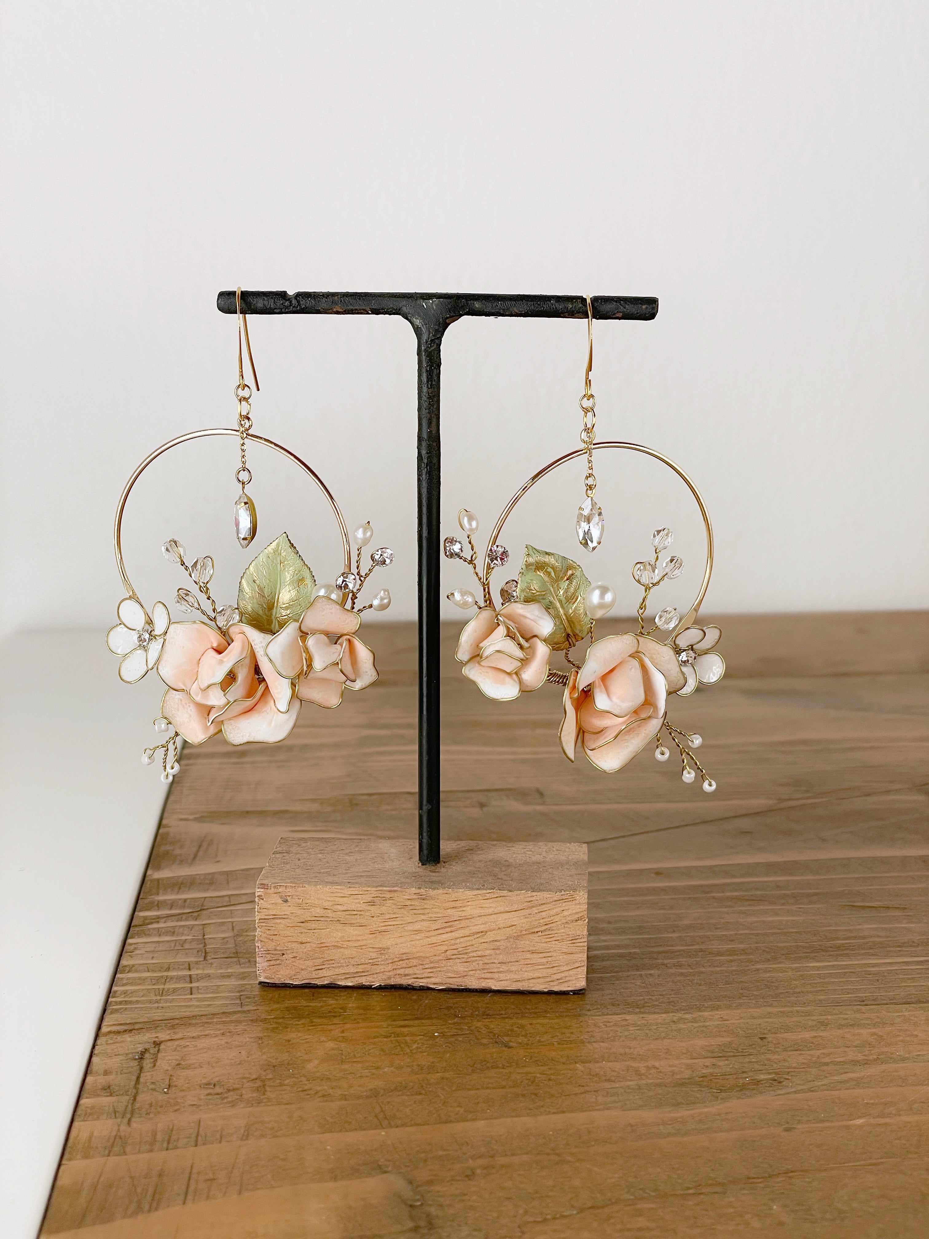 Fermaglio modellabile per sposa con fiori rosa cipria smaltati a mano e dettagli dorati.Gioiello per capelli con perle naturali di fiume e cristalli Swarovski per un'acconciatura nuziale raffinata.