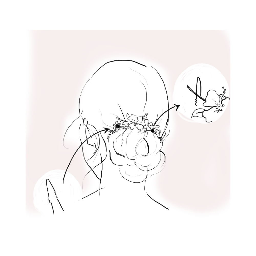 - Dopo aver posizionato il fermaglio tra i capelli, inserisci le forcine, una per lato, a 1-2 cm dalle estremità (L'eventuale terza forcina può essere posizionata al centro).