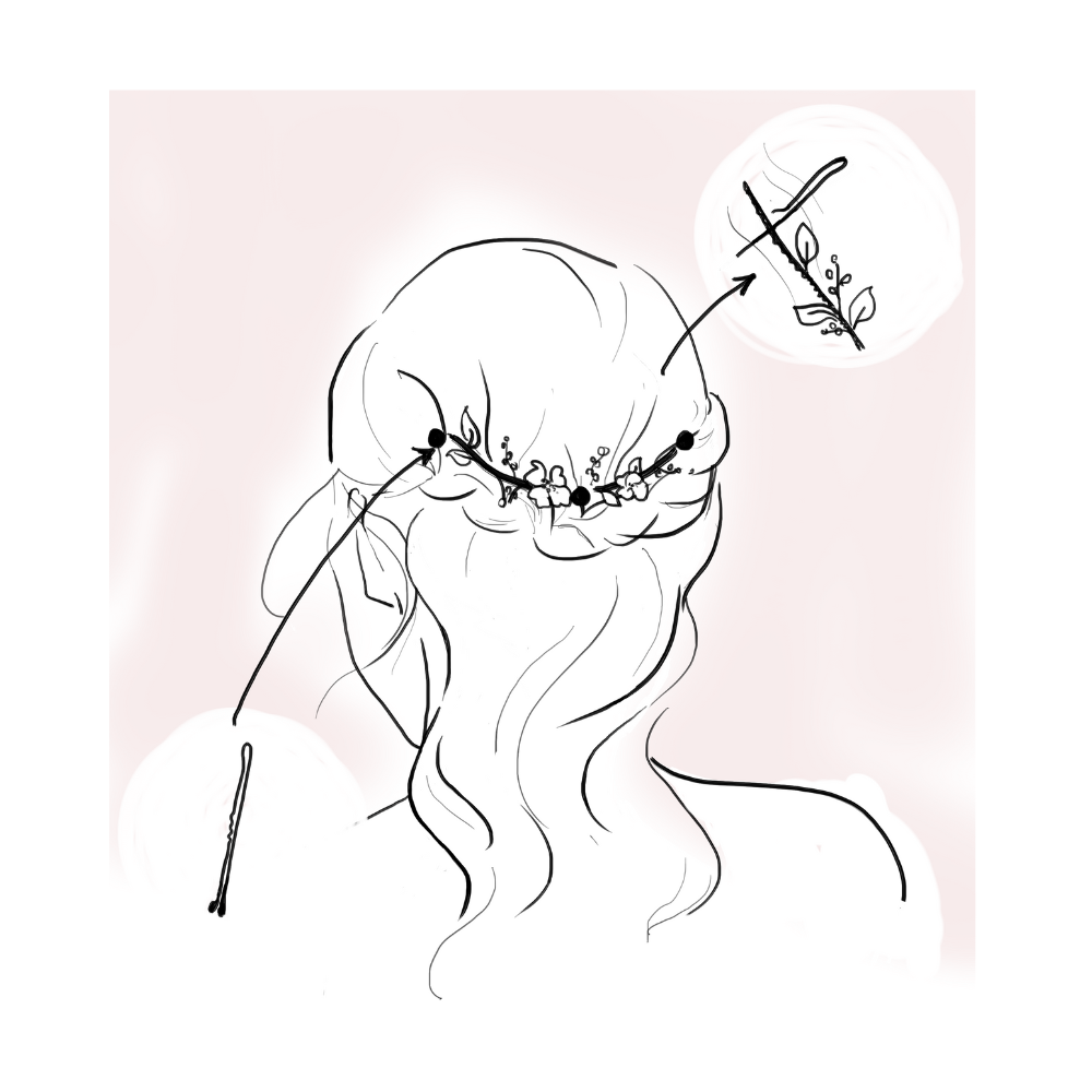 - Dopo aver individuato e posizionato il tralcio tra i capelli, puoi fissarlo con le forcine alle estremità e, per i tralci più lunghi, in un terzo punto centrale.