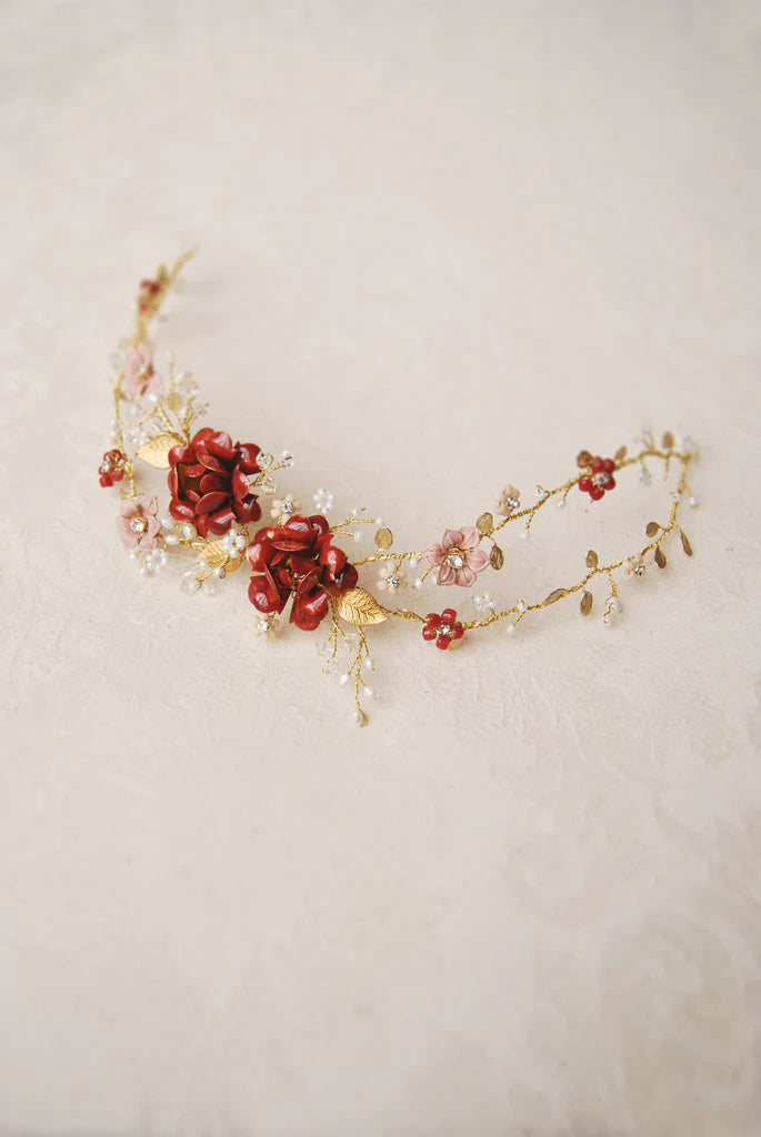 Il rosso è energia pura e personalità. Creare un accessorio personalizzato in queste sfumature significa lavorare con la passione stessa, trasformando un colore così potente in un dettaglio di estrema classe. Che si tratti di un pettinino con rose scarlatte o di un fermaglio rampicante creato appositamente per te, ogni pezzo è studiato per armonizzarsi con la tua visione di eleganza e con l’intensità del tuo amore.