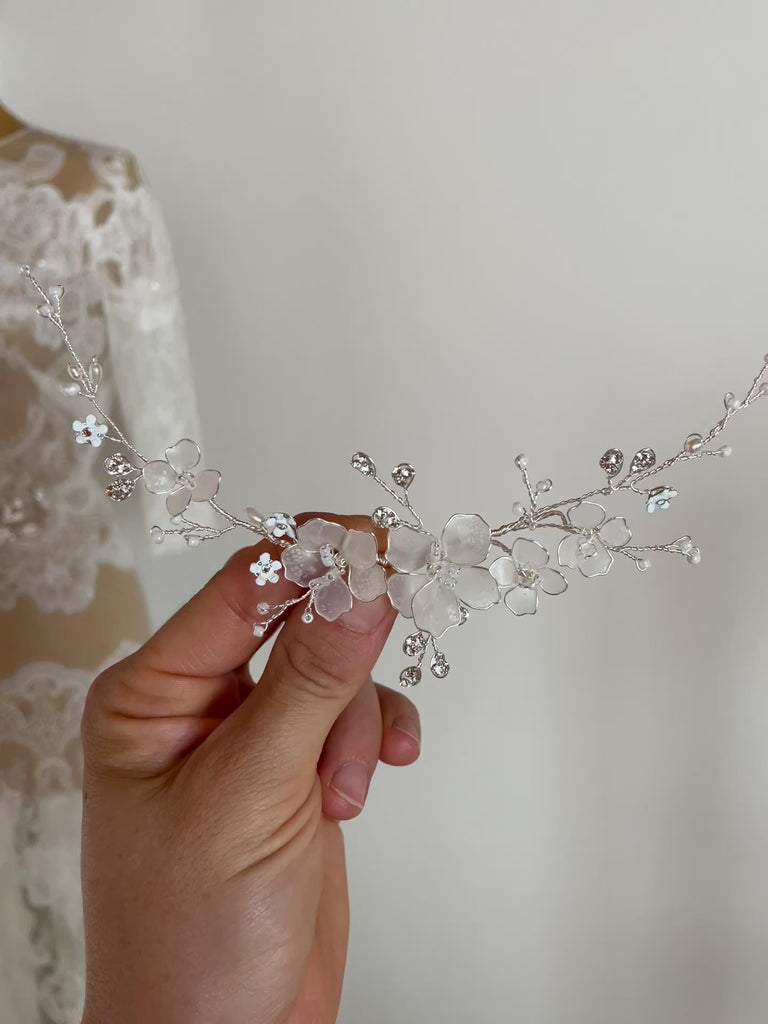 Il Fermaglio Fiori di Ciliegio celebra la delicatezza dei fiori di primavera in un dettaglio floreale unico. Questo gioiello raffinato valorizza ogni acconciatura, donando alla sposa un tocco romantico e luminoso che cattura lo sguardo.